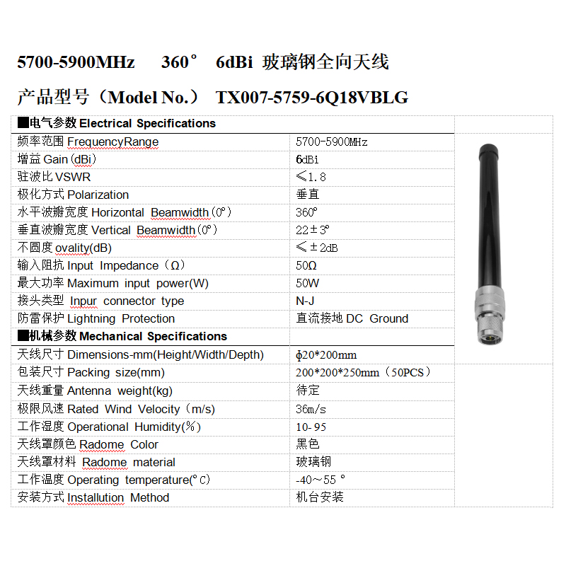 代谢物名称:全向玻离钢wifi全向天线5.8G 6dbi无人化机反制紫装 短玻离钢wifi全向天线